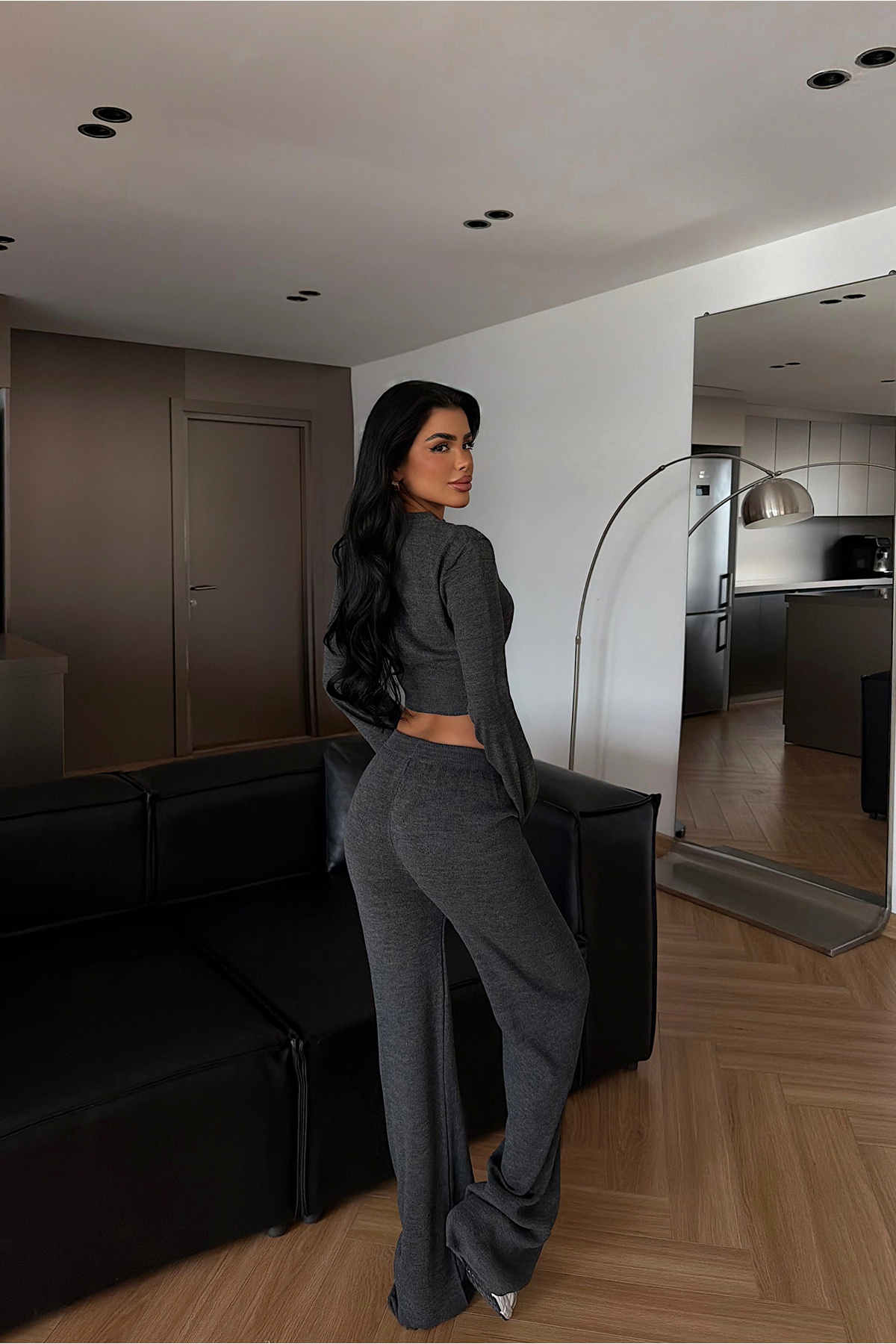 Düğmeli crop üst ve bağcıklı pantolondan oluşan triko takım, vücuda uyumlu kesimiyle modern ve feminen bir siluet sunar. Yumuşak dokulu triko yapısı konfor sağlarken, sade ve şık tasarımı günlük ve şehir stilinde dengeli bir görünüm oluşturur