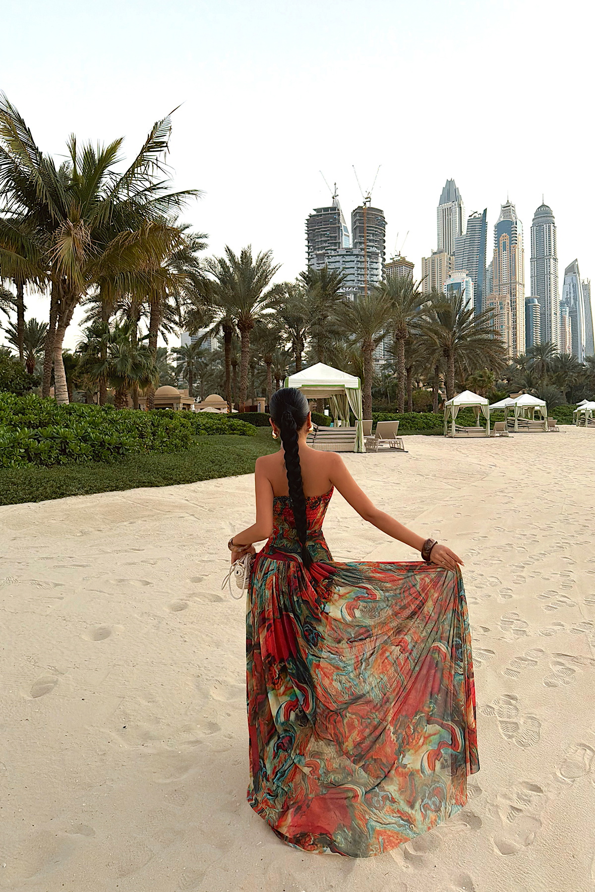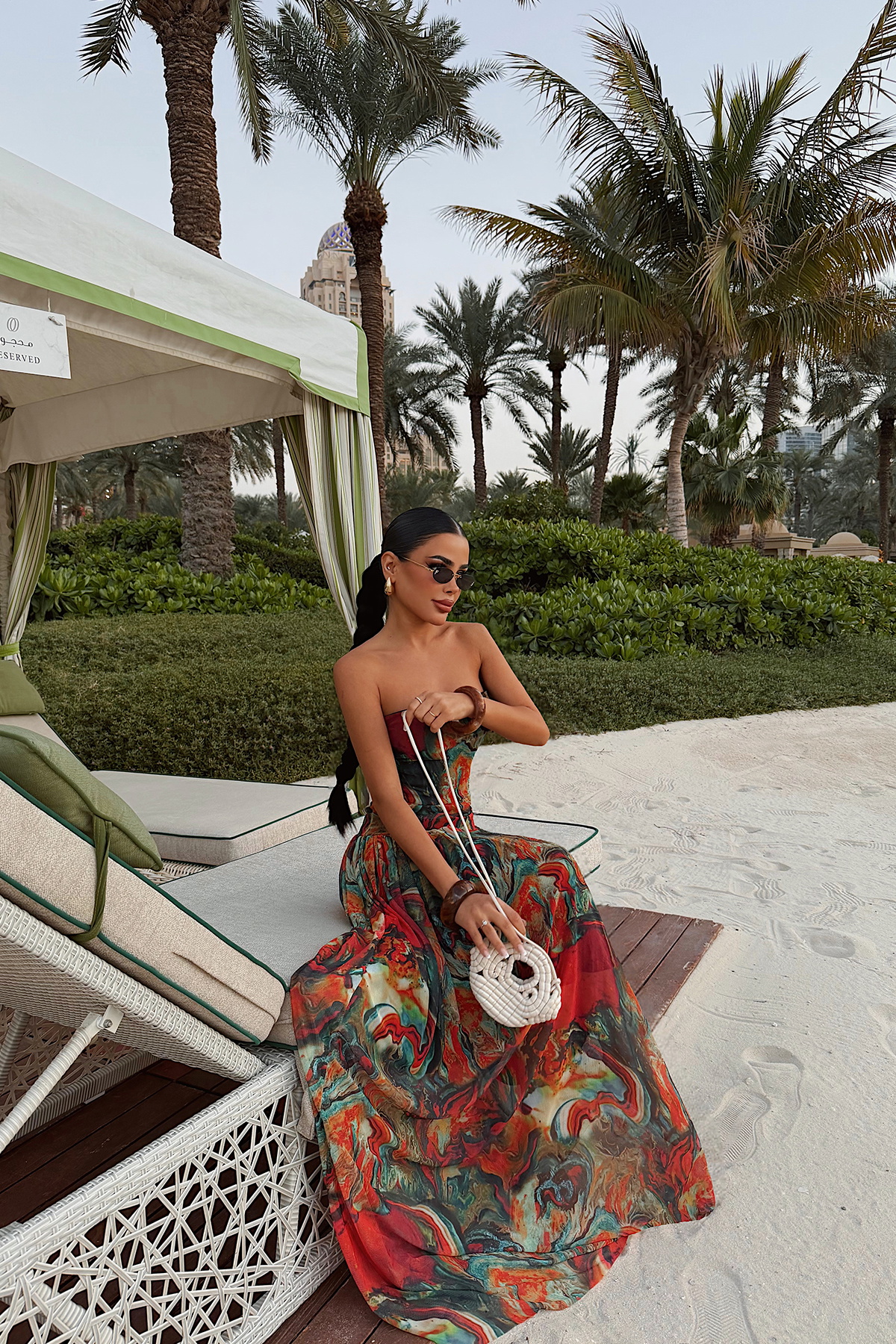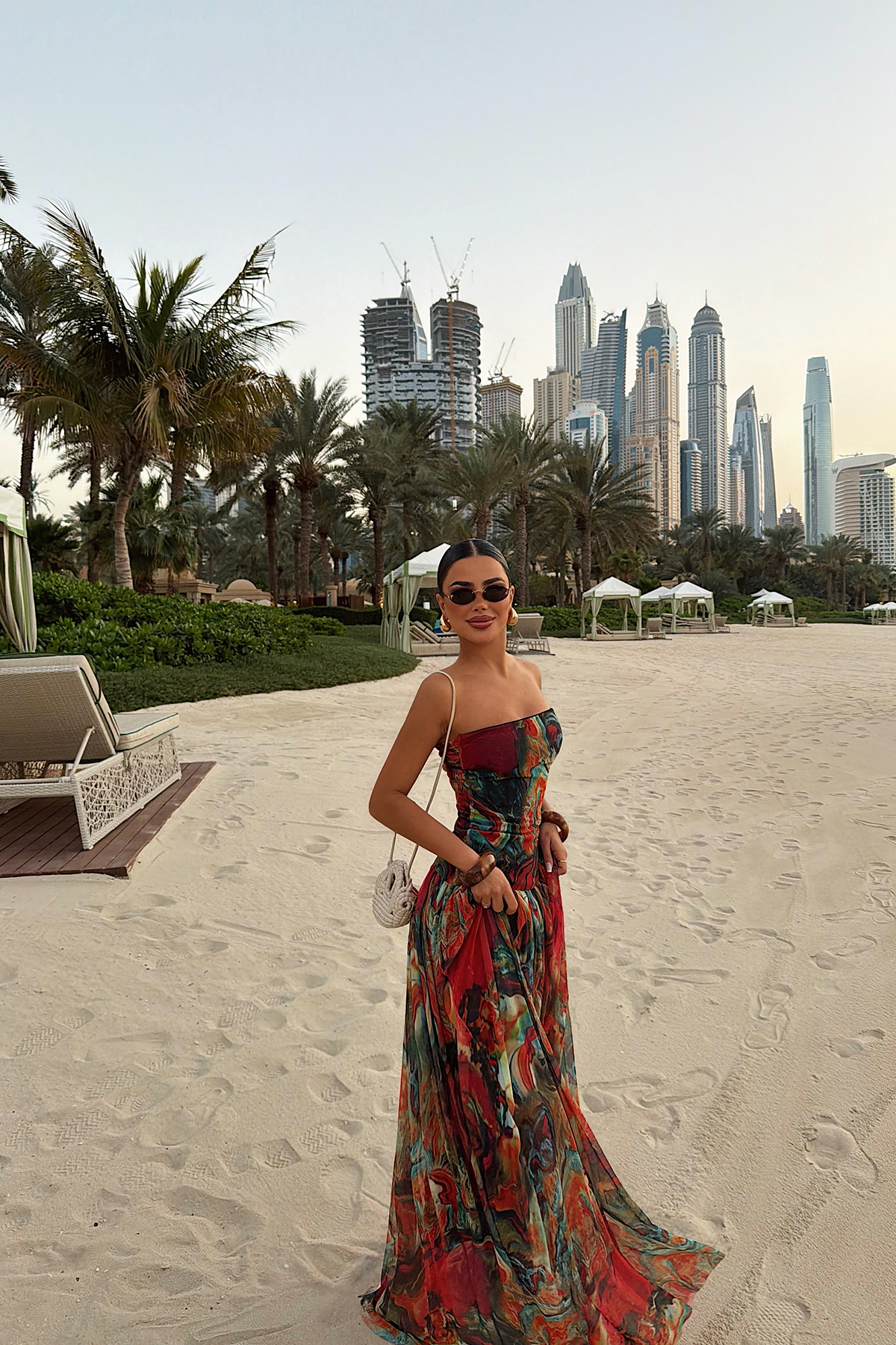 Canlı ve dikkat çekici deseniyle öne çıkan bu straplez uzun elbise, modern ve zarif bir siluet sunar. Omuzları açıkta bırakan straplez form, üst bedeni ön plana çıkarırken; vücuda oturan üst kısmı beli dengeli şekilde vurgular. Belden aşağı doğru genişleyen etek kesimi ise elbiseye akıcı ve hareketli bir görünüm kazandırır.
