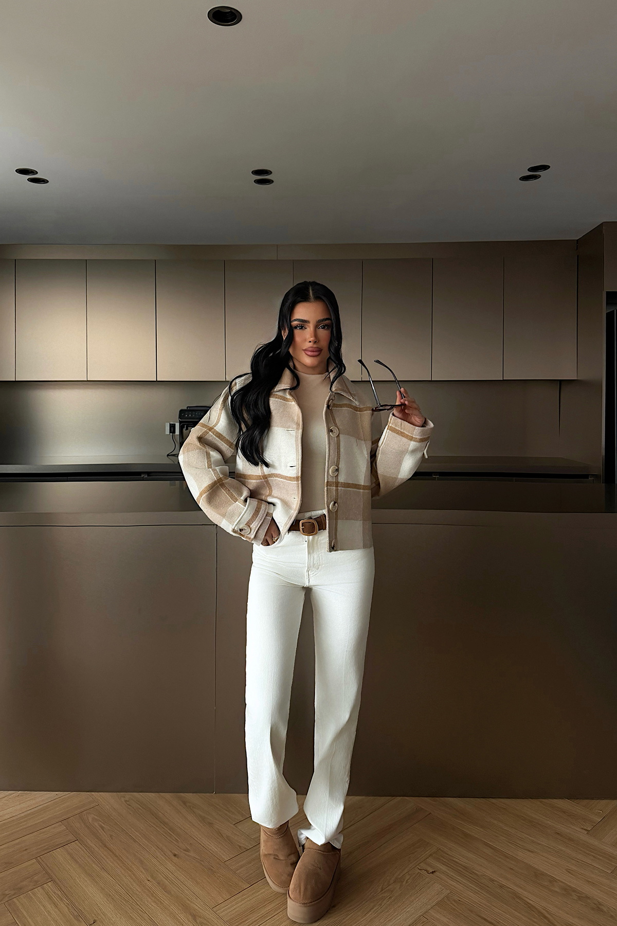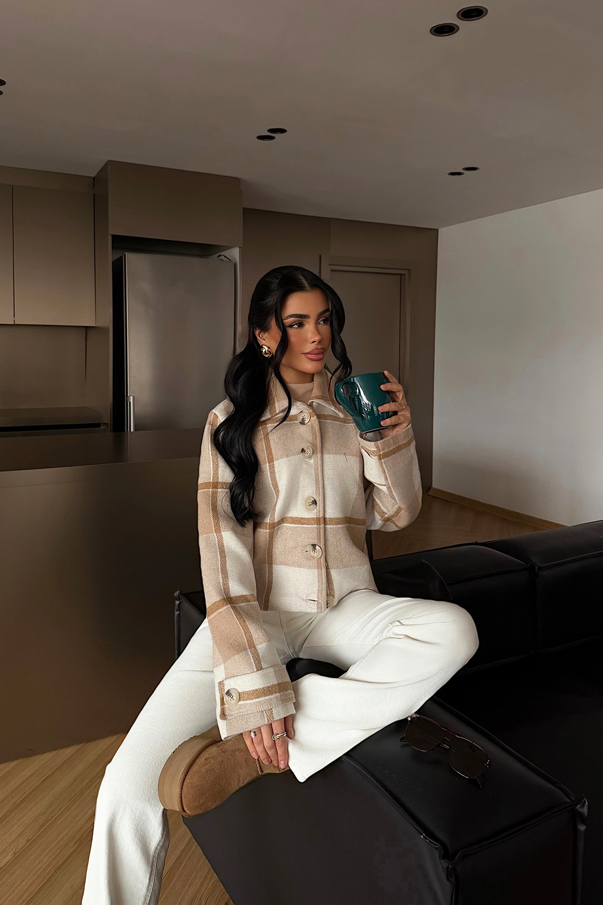 Ekose desenli yapısı ve kısa kesimiyle öne çıkan ceket, tok duruşu sayesinde modern ve net bir siluet sunar. Düğmeli tasarımı ve rahat kalıbı ile günlük şehir kombinlerinden şık stillere kadar çok yönlü kullanım sağlar.