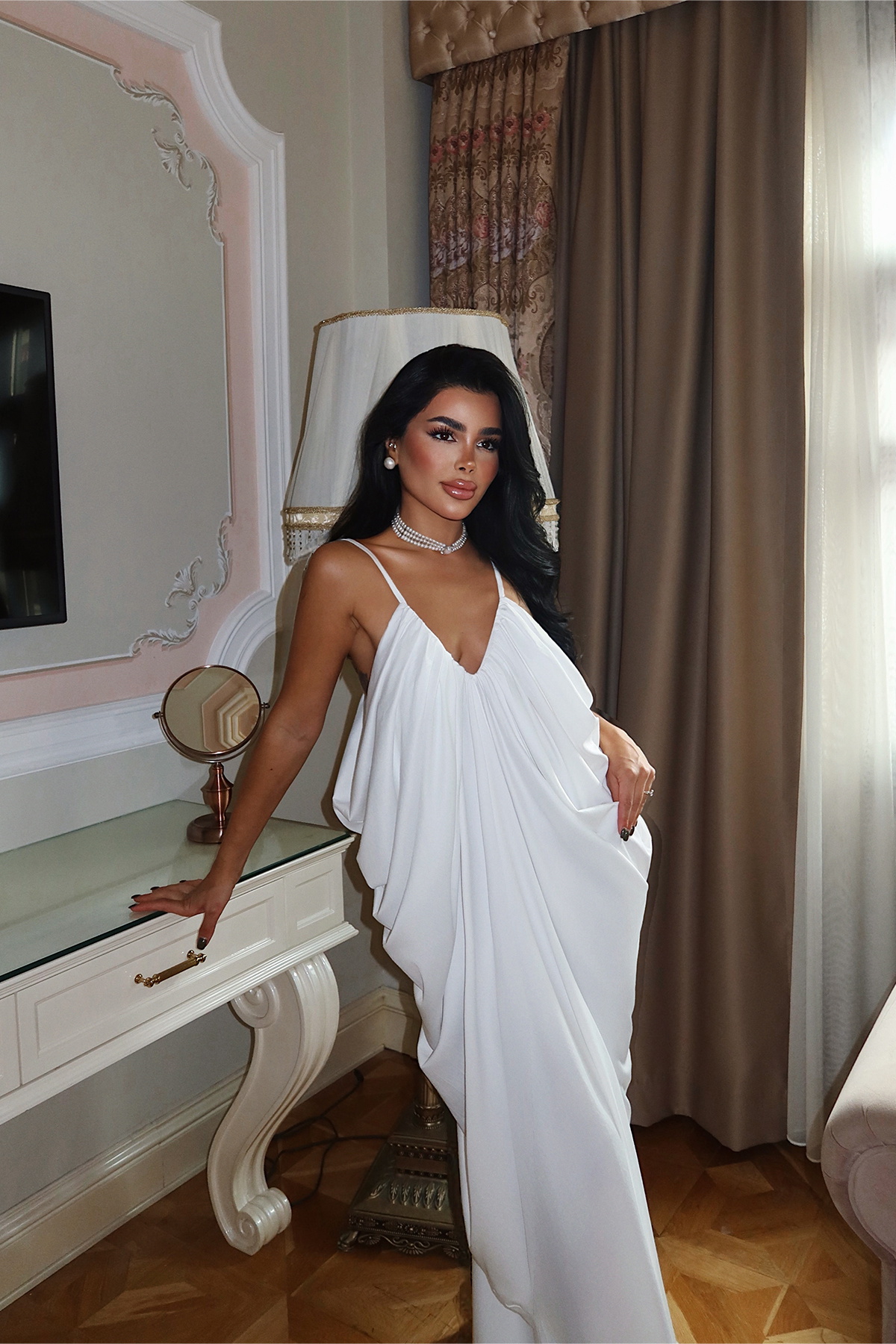 Beyaz Tulula Uzun Saten Elbise, zarafeti sade bir ışıltıyla buluşturuyor. Akıcı saten dokusu, ışığı yumuşakça yansıtarak asil bir görünüm sunarken, uzun kesimi modern bir zarafet hissi yaratıyor. Düğün, davet ve özel kutlamalarda minimal ama etkileyici bir duruş sergilemek isteyenler için kusursuz bir seçim.