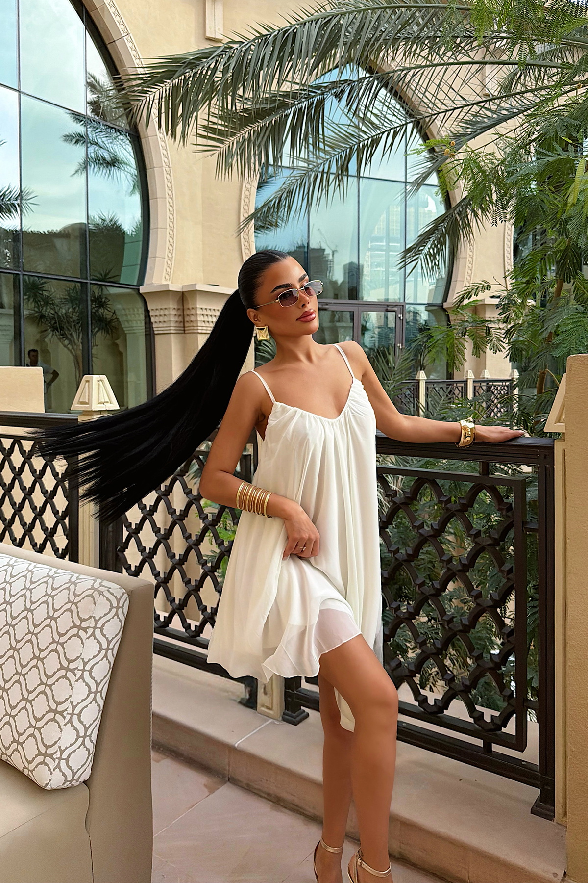 İnce askılı ve dökümlü formuyla öne çıkan elbise, hafif kumaşı sayesinde gün boyu konforlu bir kullanım sunar. Rahat kalıbı vücudu sıkmadan sararken, sade ve zarif duruşu hem günlük hem tatil kombinleri için ideal bir görünüm oluşturur.