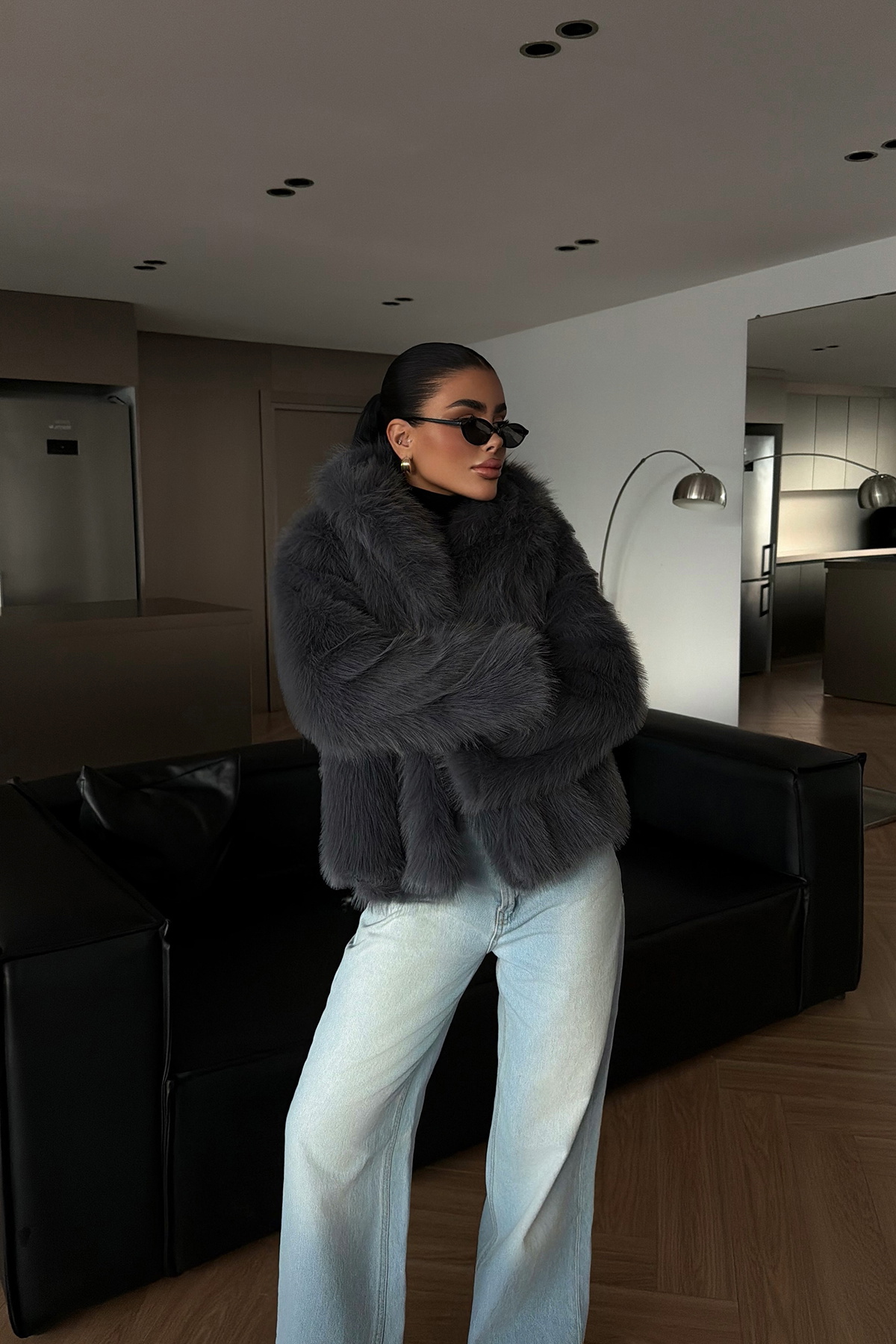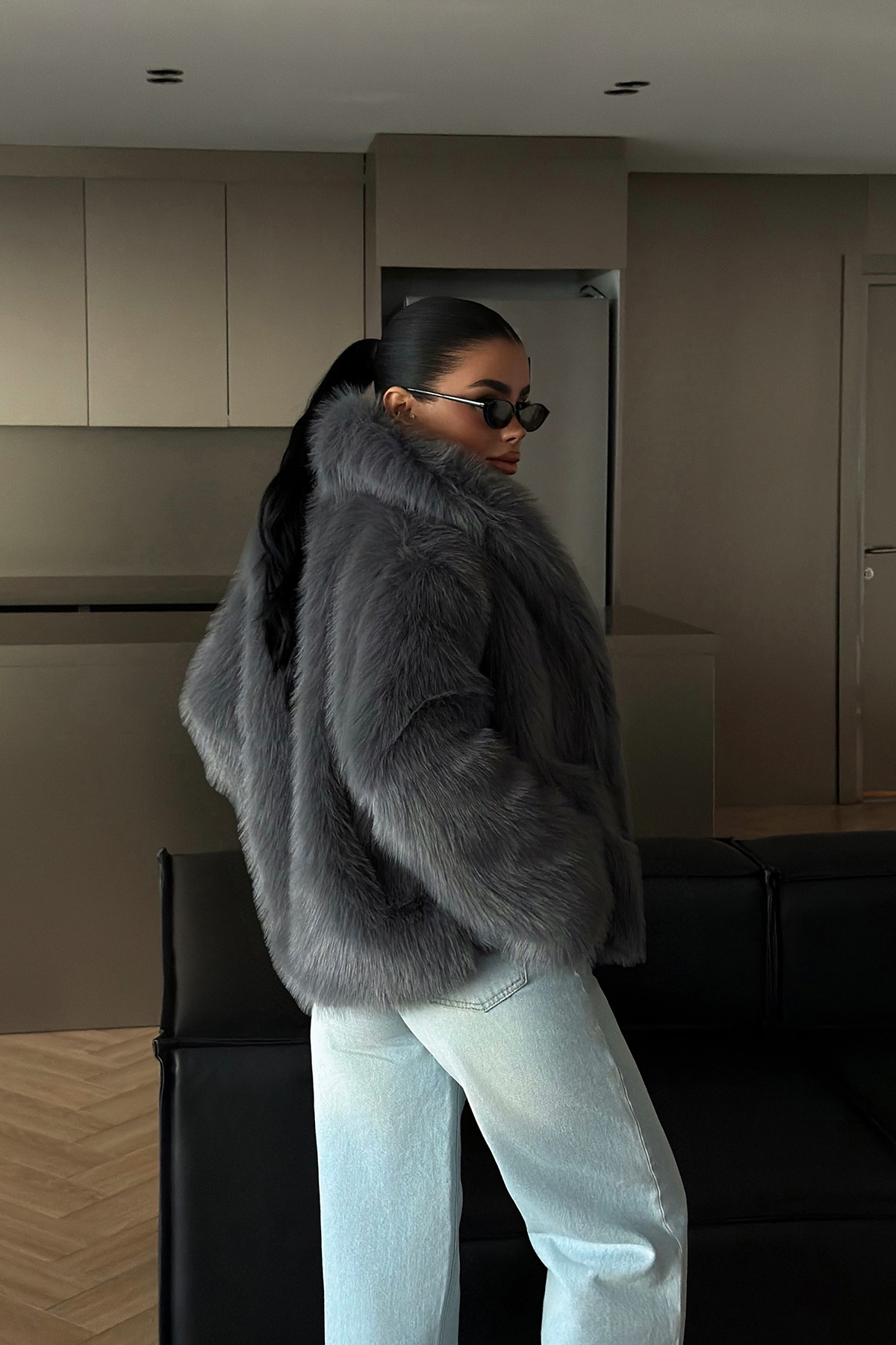 Şık ve dikkat çekici bir dış giyim parçası: Soğuk grinin lüks tonlarından olan füme renk üzerine yerleştirilmiş kürk yaka ve manşetlerde zenginleştirilmiş bu ceket, klasik kesimiyle rahat bir şekilde şehir stiline adapte oluyor. İç astarlı ve üst düzey duruşuyla soğuk havalarda şıklığınızı korumanız için ideal.