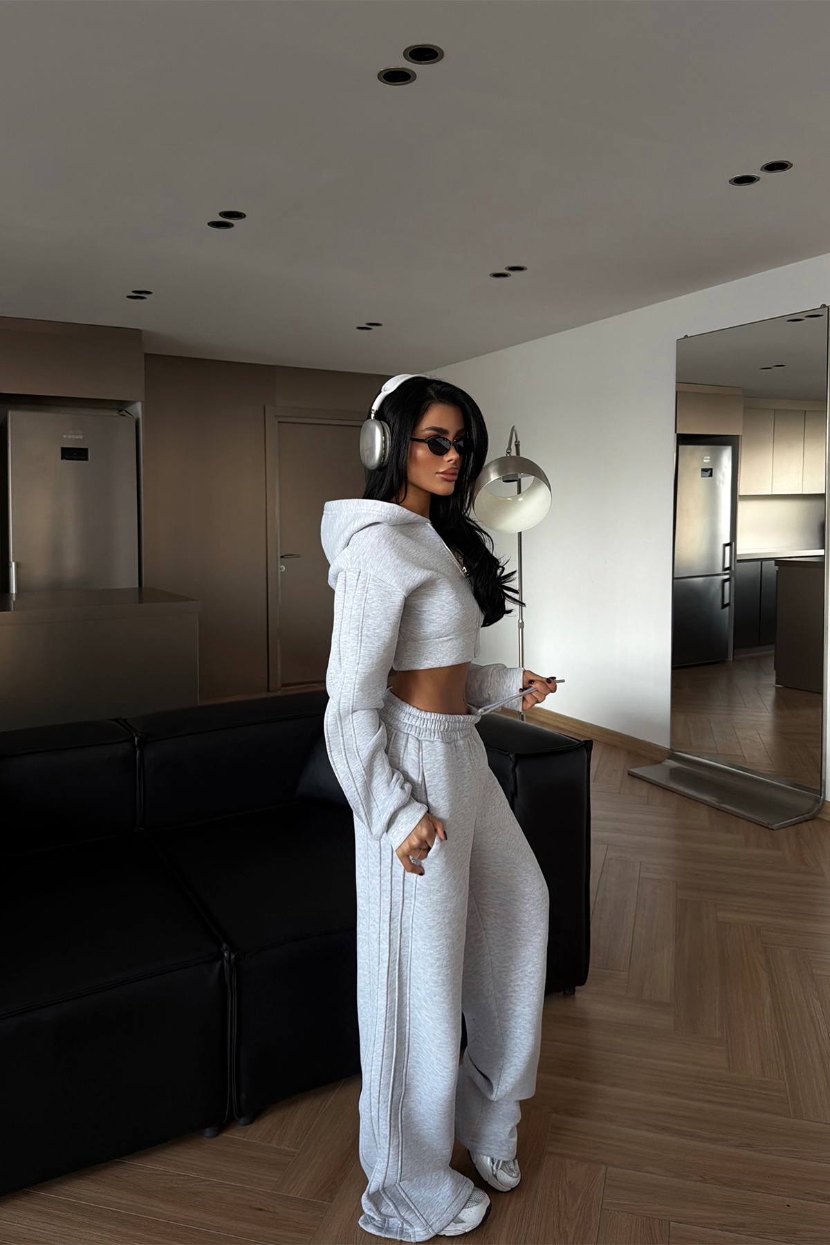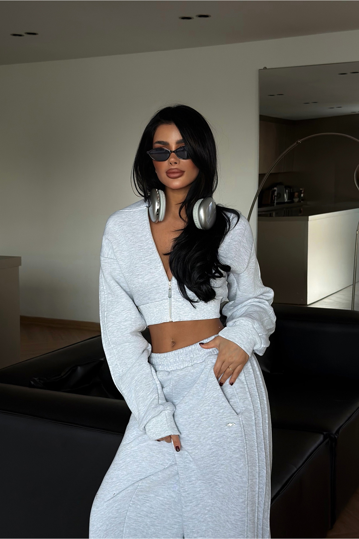 Gri tonundaki bu eşofman takımı, önde yer alan fermuar detayı ile modern bir sportif görünüm sunar. Üst parçası hafif oversize kesimle rahat kullanım sağlarken, alt parça bel ve paça detaylarıyla desteklenmiş düz formundadır. Günlük şehir stiline uygun olduğu gibi ev-konforunda bir takım arayanlar için de ideal bir tercih.
