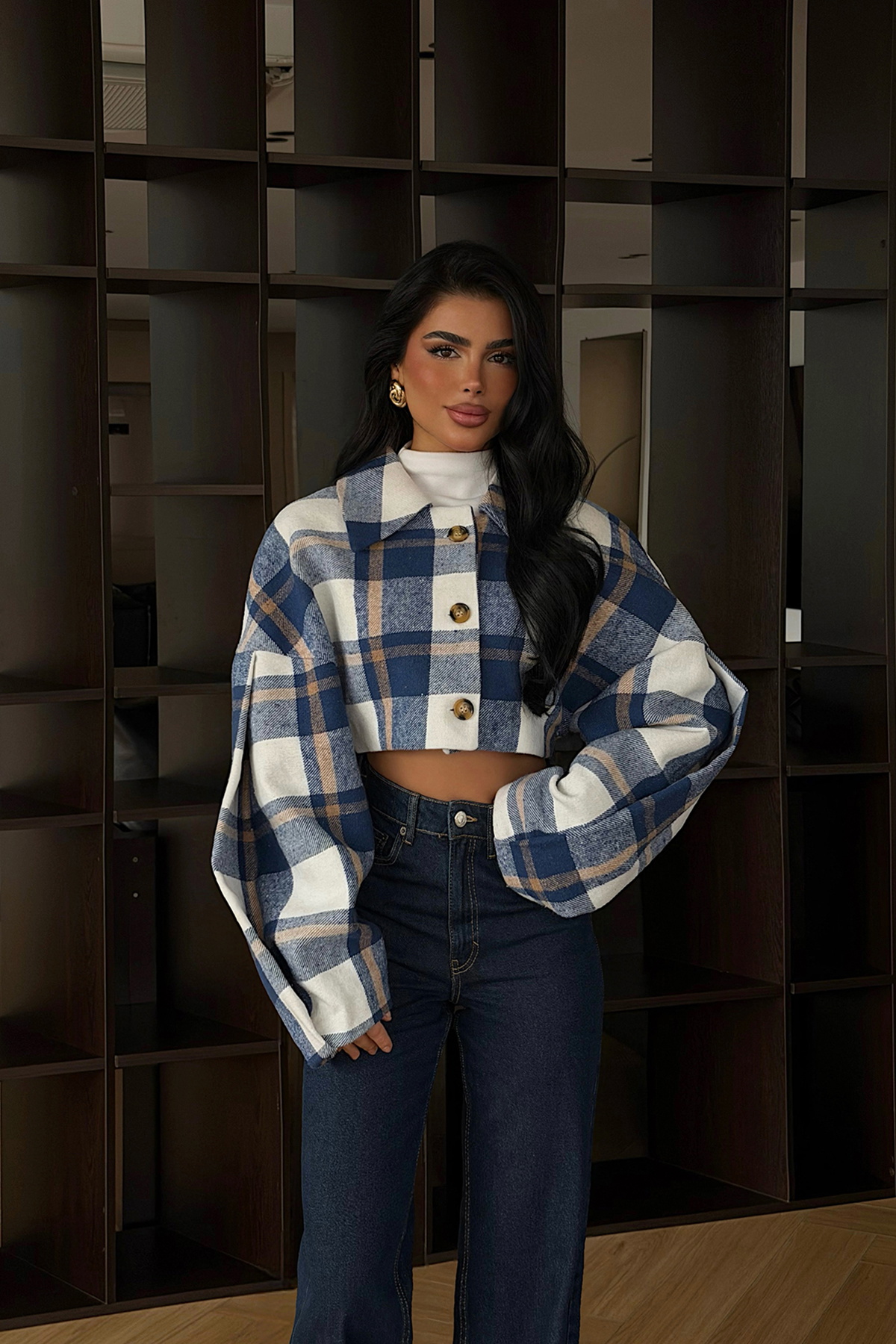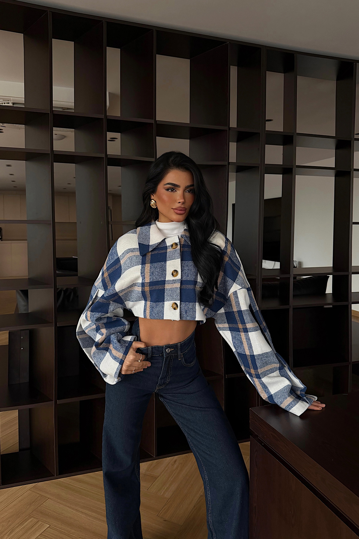 Ekose desenli, düğmeli crop ceket; kısa kesimi ve tok yapısıyla modern ve iddialı bir siluet sunar. Uzun kollu formu ve net çizgileri sayesinde şehir stilinde güçlü ve şık kombinler için ideal bir parçadır.