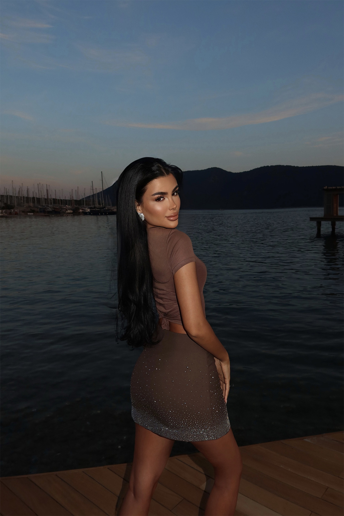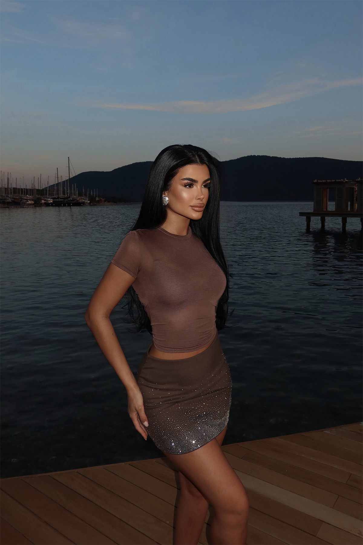 Taş detaylı yüzeyi ve vücuda oturan formuyla öne çıkan mini etek, sade kesimi sayesinde şık ve iddialı bir görünüm sunar. Işıltılı dokusu kombinlere feminen bir hava katarken, özel davetlerden gece stiline kadar farklı kombinlerle rahatlıkla kullanılabilir.