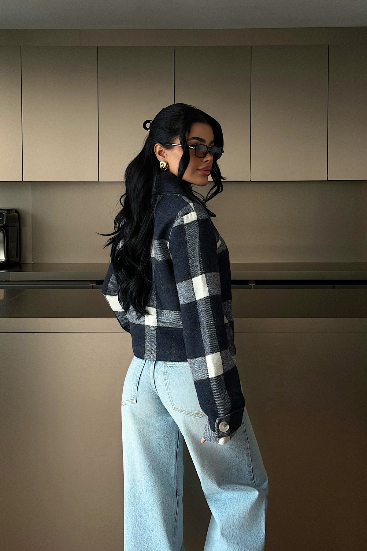 Ekose desenli yapısı ve kısa kesimiyle öne çıkan ceket, tok duruşu sayesinde modern ve net bir siluet sunar. Düğmeli tasarımı ve rahat kalıbı ile günlük şehir kombinlerinden şık stillere kadar çok yönlü kullanım sağlar.