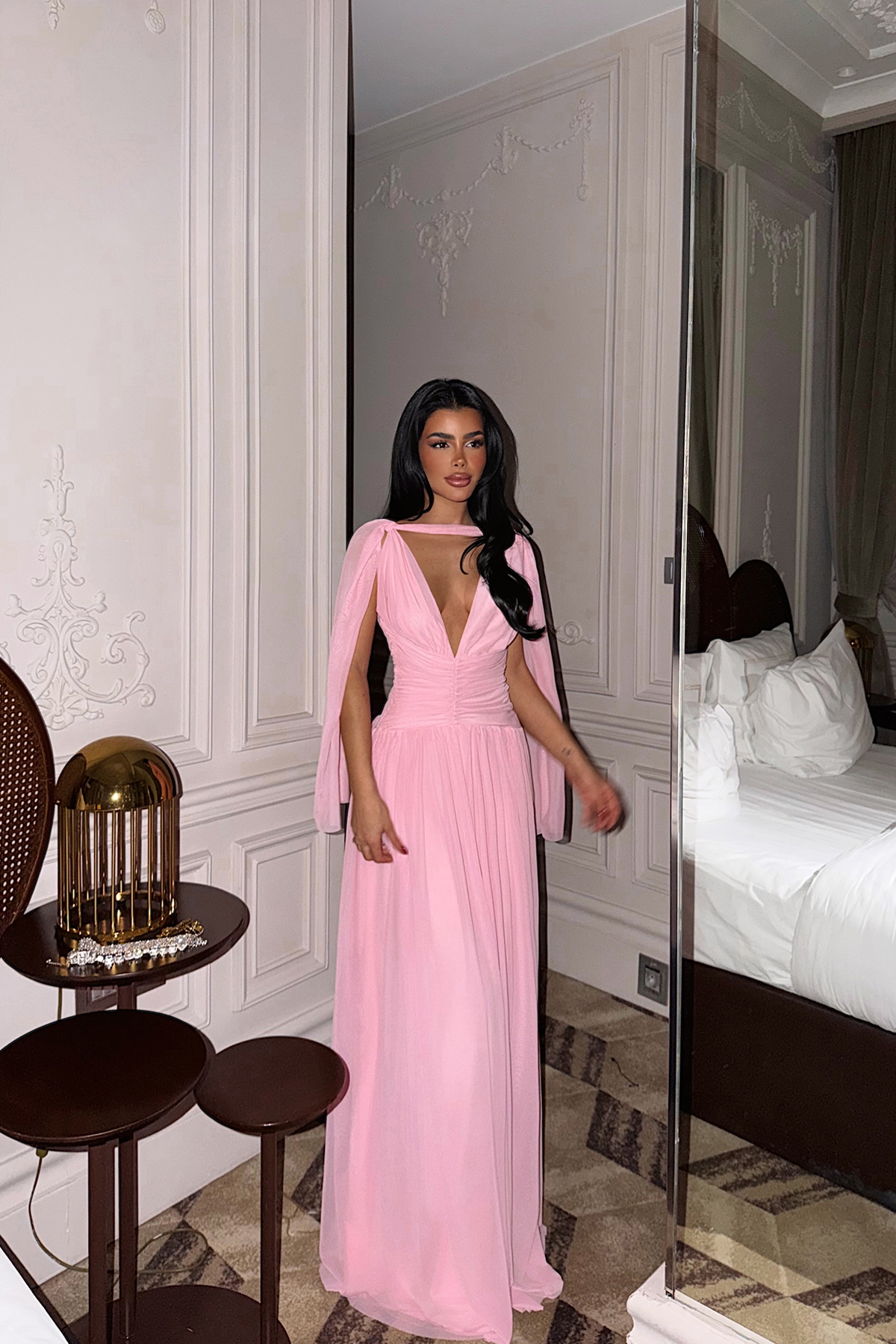 Pastel pembe tonuyla feminen ve zarif bir görünüm sunar. Elbise, büzgü detaylarıyla vücut hatlarını nazikçe vurgular. Kumaşı yumuşak, akışkan ve dökümlü bu sayede elbise, hem zarif duruşu hem de rahat hareket imkânı sağlar