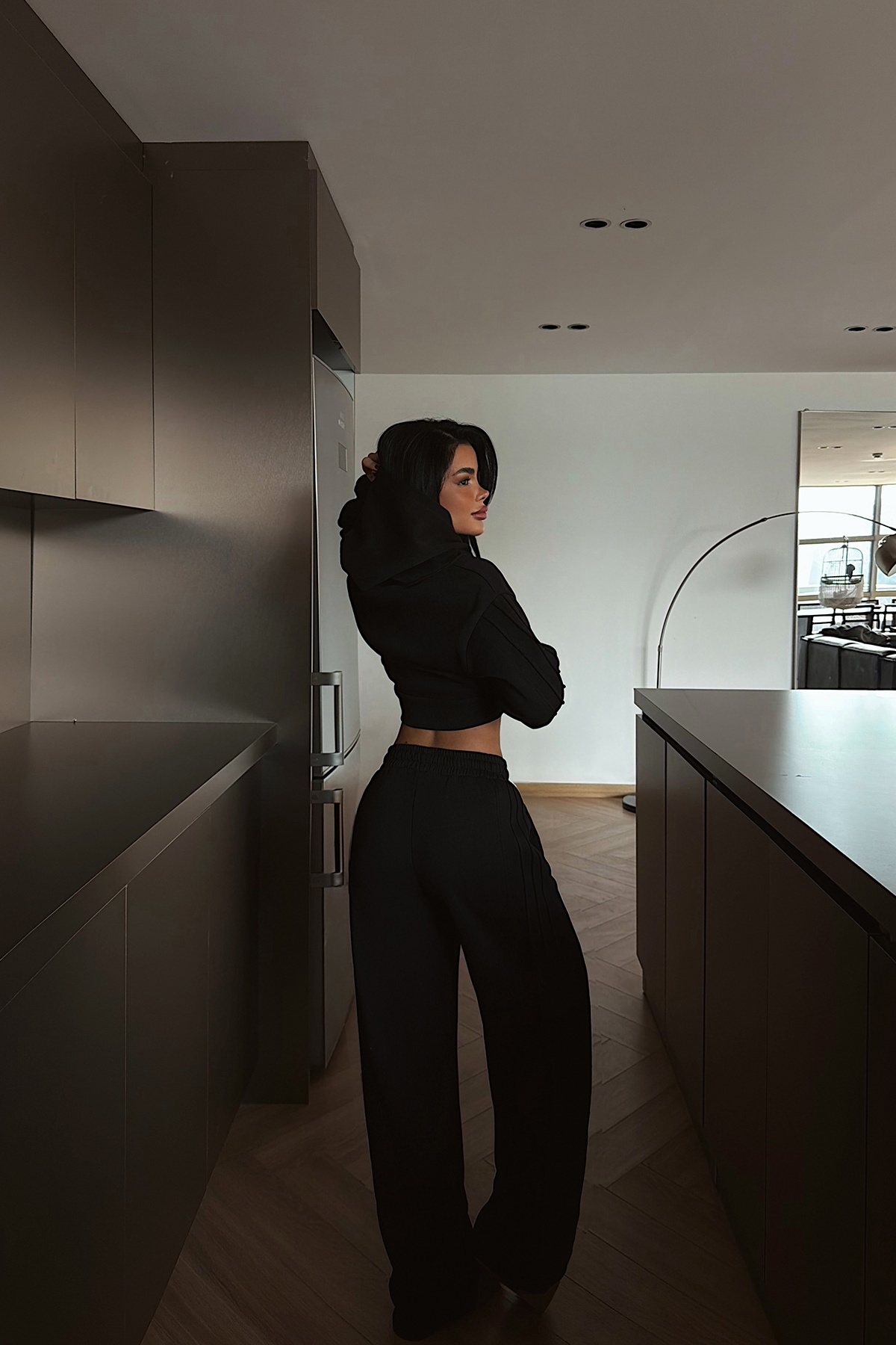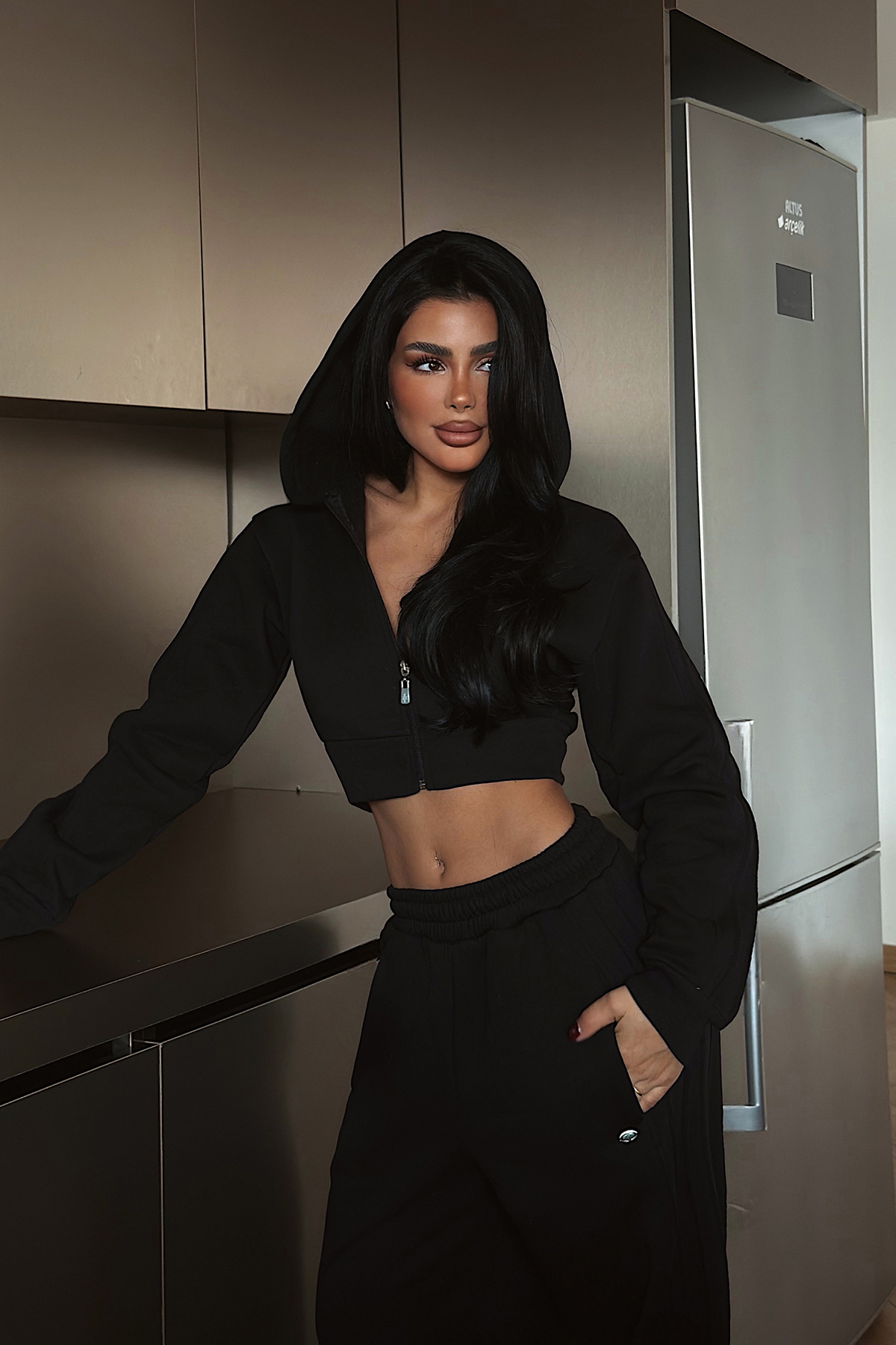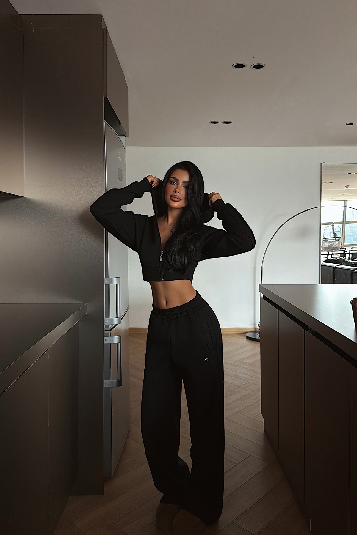 Tamamen siyah renkte, ön kısmındaki belirgin fermuar detayıyla dikkat çeken bu eşofman takımı, sade ama etkili bir sportif şıklık sunuyor. Üst kısmı hafif oversize kesimiyle rahat giyimi desteklerken, alt parça düz paçalı ve bel bölgesi esnek yapısıyla gün boyu konfor sağlar.
