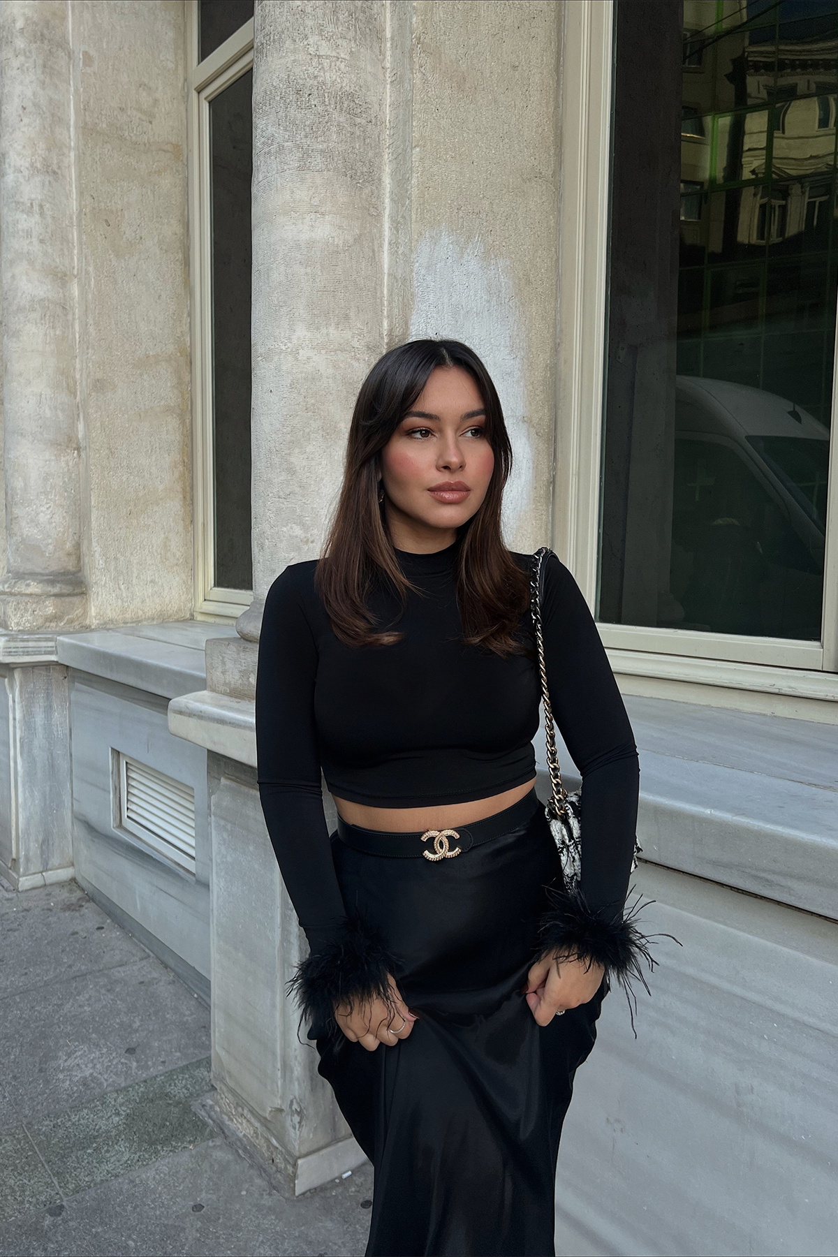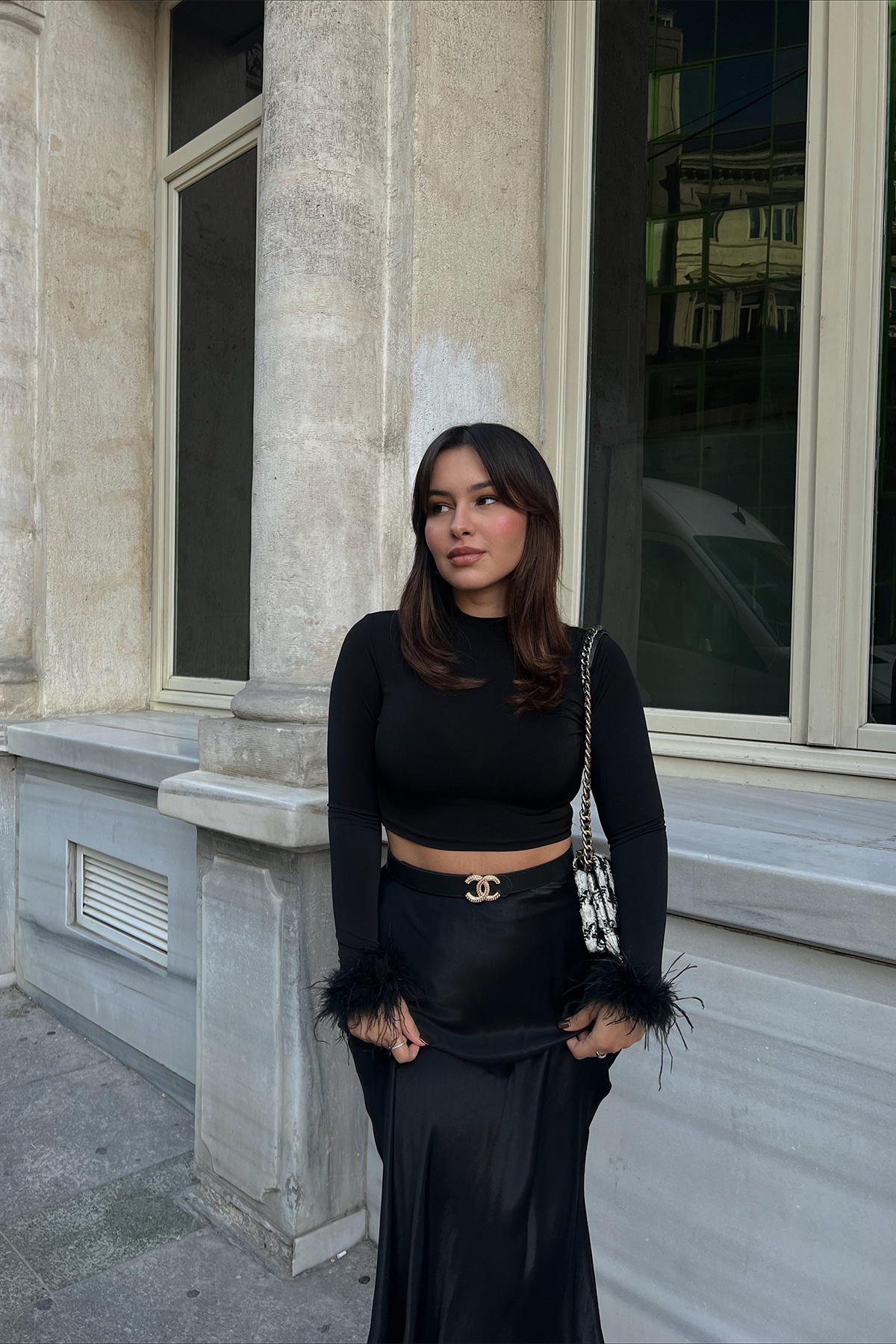 Klasik siyah rengiyle öne çıkan Genji Bluz, tüy detaylarıyla tasarıma zarif bir hareket katıyor. Modern kesimi ve minimalist çizgisi, özel davetlerden şehir akşamlarına kadar her ortamda şıklığınızı ön plana çıkarır. Hem feminen hem de sofistike bir duruş arayanlar için ideal bir parça.