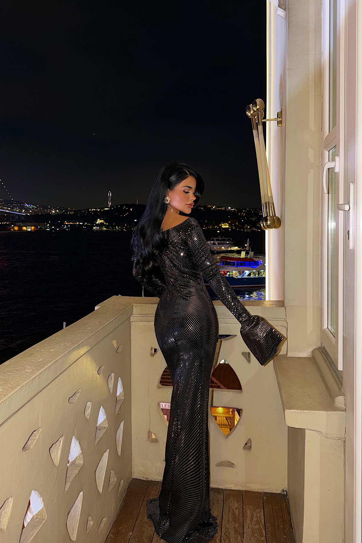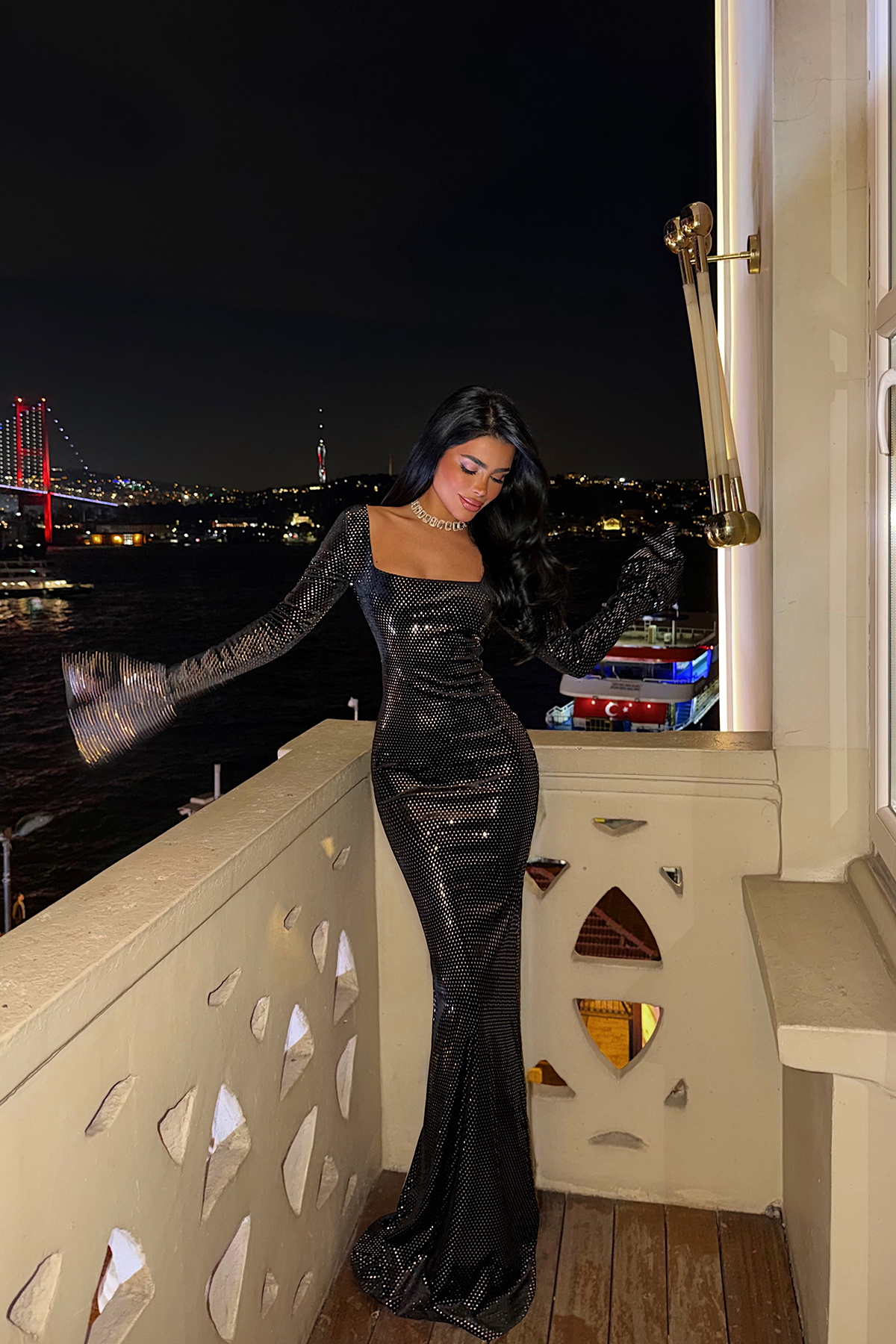 Parlak pul payetlerle süslenmiş, göz alıcı ve zarif bir gece elbisedir. Siyah zemin üzerine serpiştirilmiş pul detayları sayesinde ışığı yakalar, hareketle birlikte hafif parlama efekti yaratır. Uzun boyu ile silueti uzatır; vücuda zarif bir şekilde oturan kesimi, düzgün dikişleri ve temiz kalıbı ile dikkat çeker. Kumaş ve payet işlemi dengeli abartılı ışıltı yerine zarif, sofistike bir şıklık sunar.