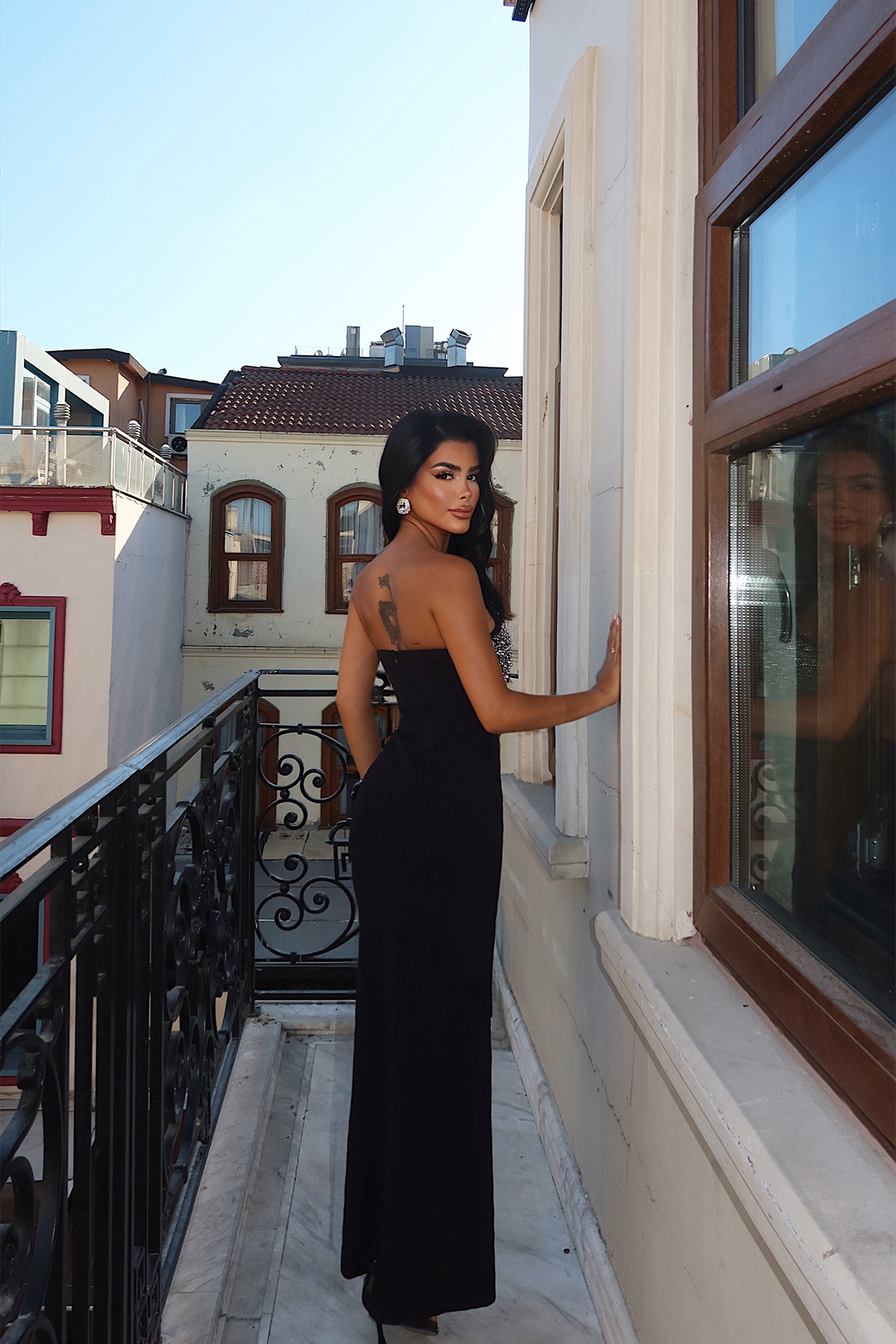Siyah Dorothy Işıltılı Abiye, zarif kesimi ve parıltılı taş işlemeleriyle klasik siyahın cazibesini modern bir dokunuşla buluşturur. Özel davetlerden davetkâr akşam yemeklerine kadar birçok ortamda sofistike bir görünüm sağlar. Hem şıklığı hem de konforu bir arada sunarak stilinizi kusursuz şekilde tamamlar.