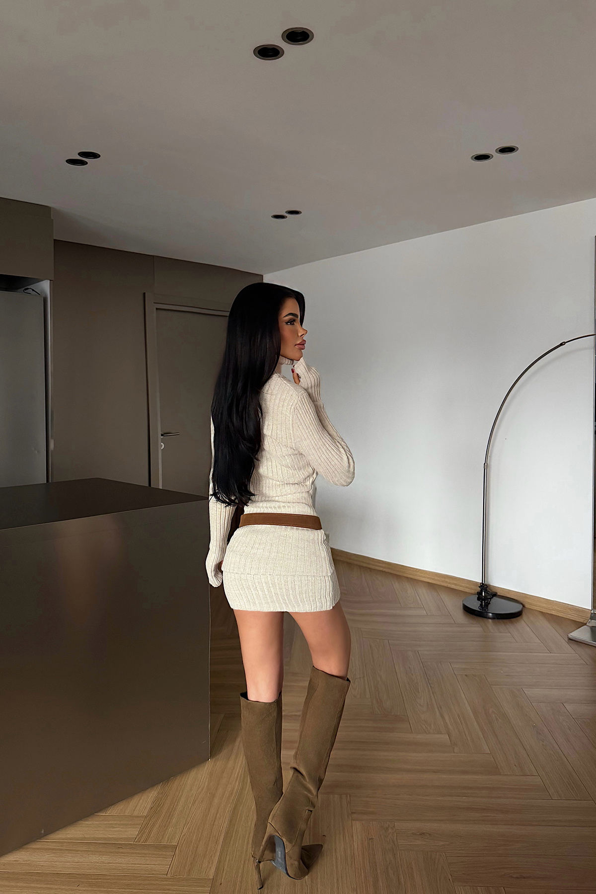 Fitilli dokusu ve vücuda oturan formuyla silueti belirgin şekilde ortaya çıkarır. Uzun kollu tasarımı ve boğazlı yaka detayı elbiseye net ve güçlü bir duruş kazandırırken, mini boy kesimi modern bir görünüm sunar. Esnek yapılı triko kumaşı sayesinde formunu korur ve düzgün bir duruş sağlar.