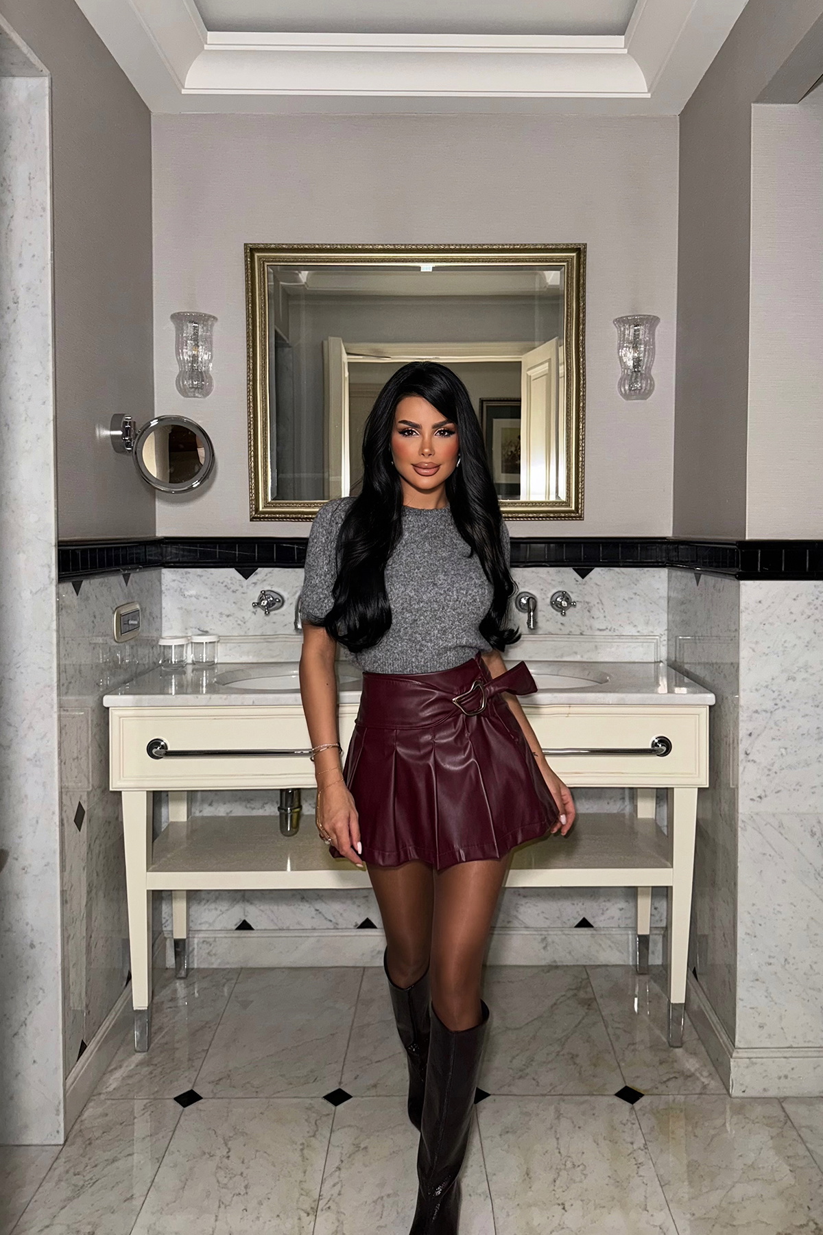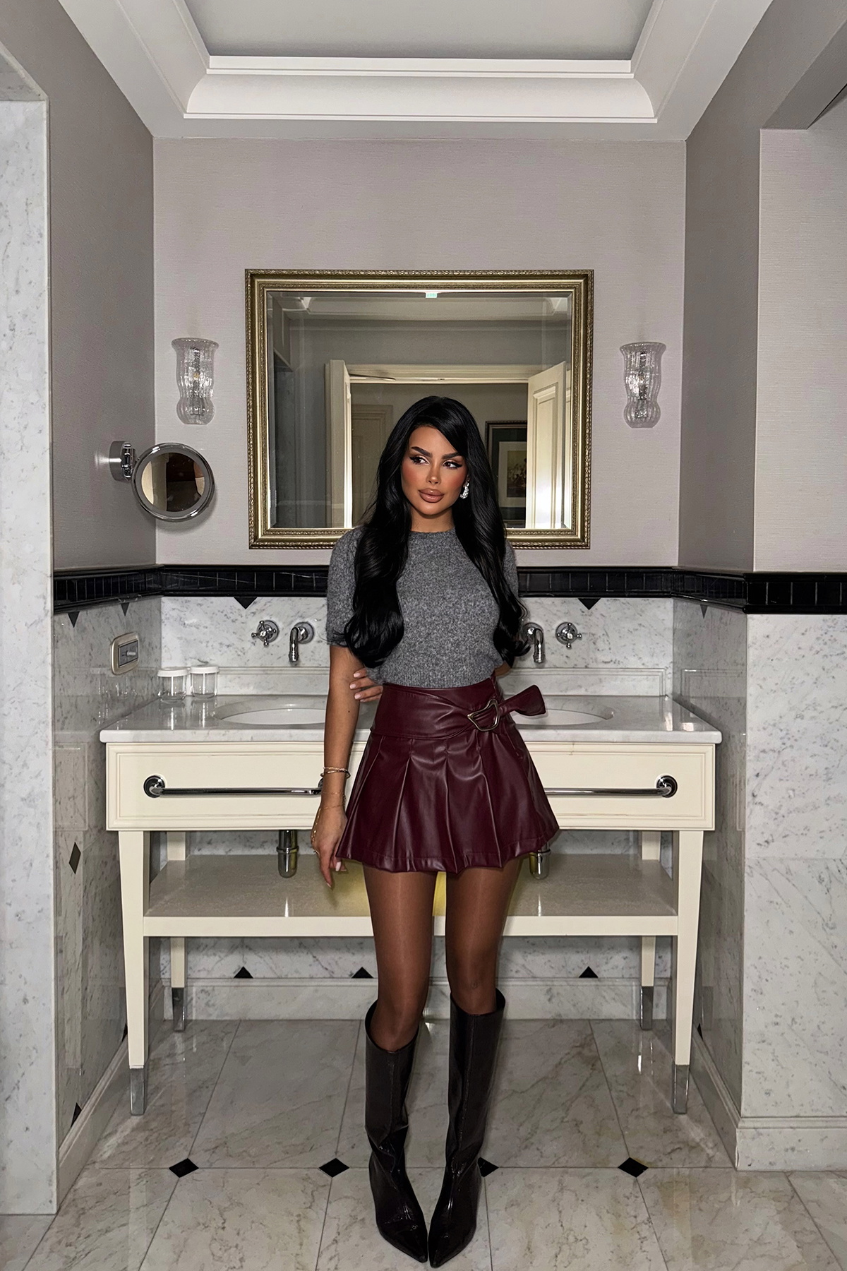 Parlak görünümlü dokusuyla dikkat çeken bu mini etek, önden kemer formundaki metal detayla stiline güçlü bir vurgu katar. Yüksek bel kesimi sayesinde vücut hatlarını zarif şekilde ön plana çıkarırken, kısa boyu modern ve iddialı bir duruş sunar.