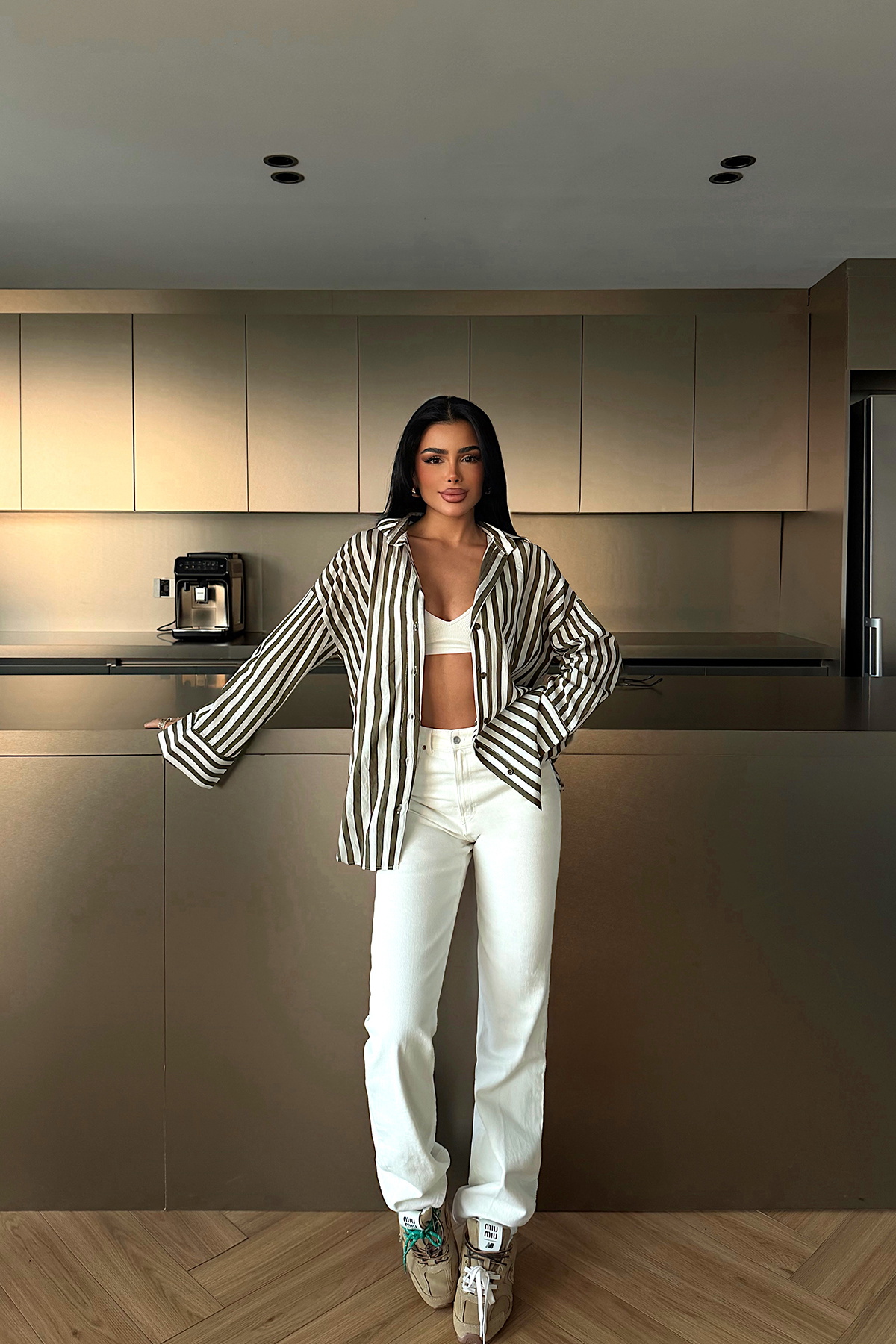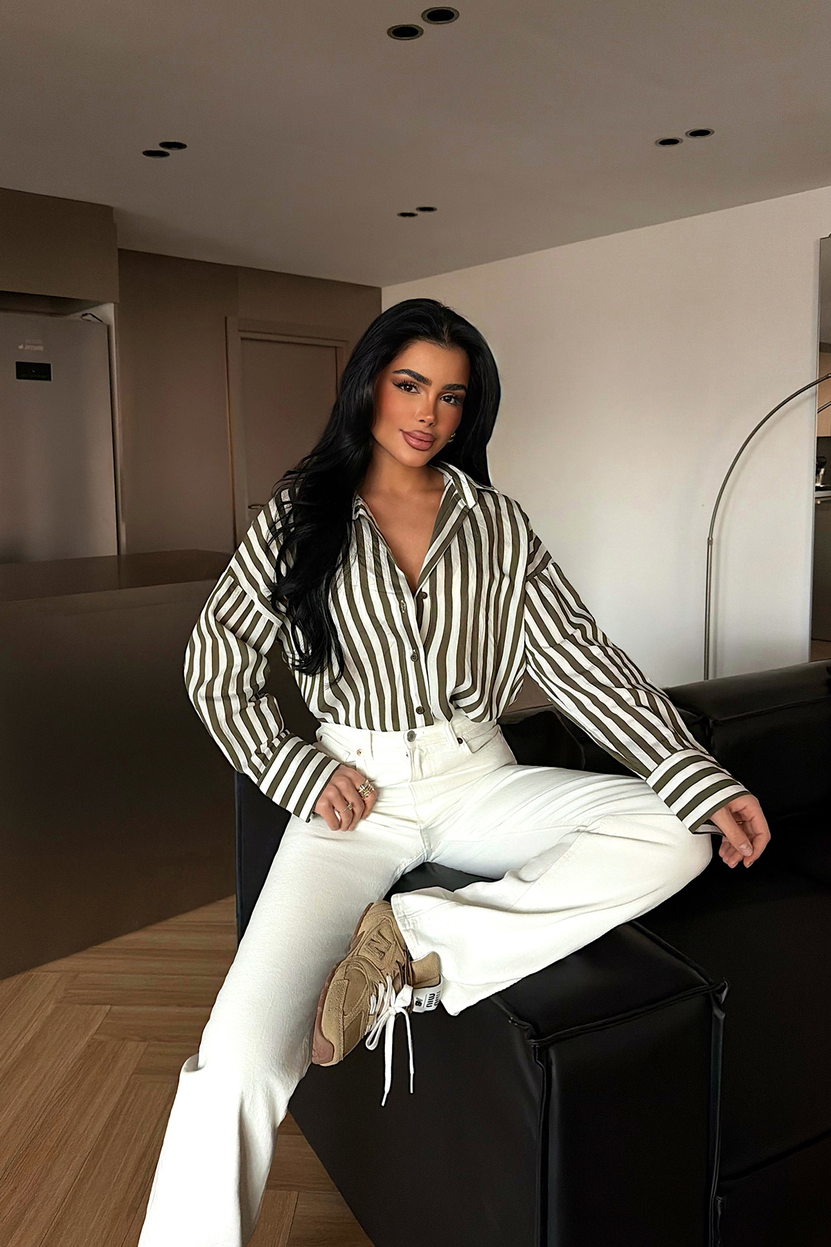 Dikey çizgili deseni ve rahat kesimiyle öne çıkan gömlek, sade ve şık bir siluet sunar. Akıcı formu sayesinde günlük kombinlerden şehir stiline kadar kolayca uyum sağlarken, zamansız tasarımıyla gardırobun kurtarıcı parçaları arasında yer alır.