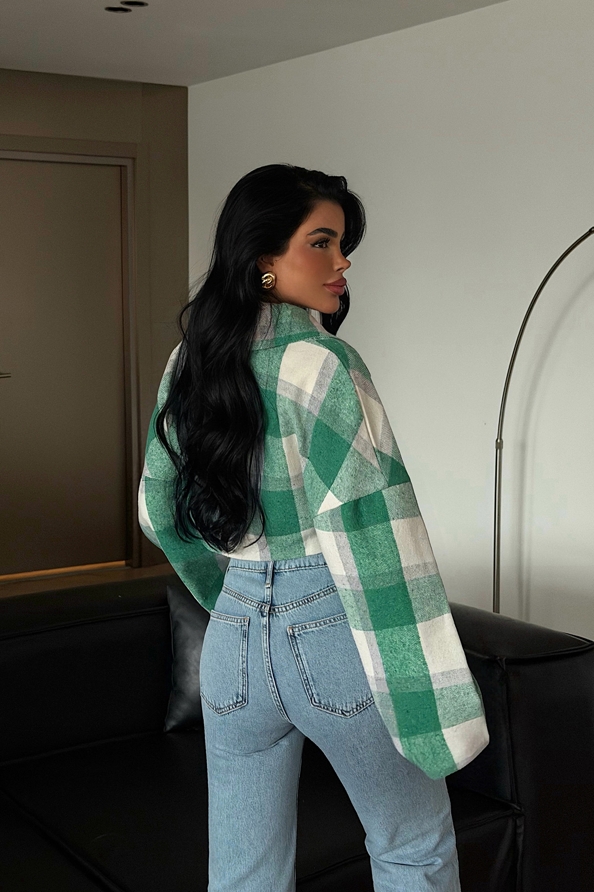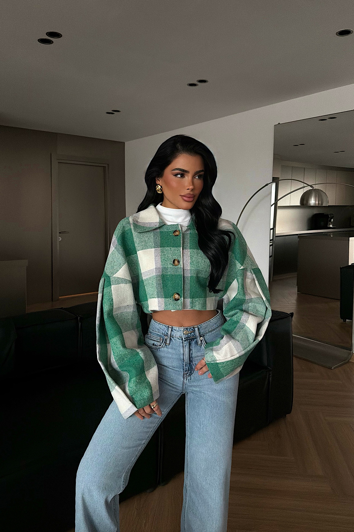 Ekose desenli, düğmeli crop ceket; kısa kesimi ve tok yapısıyla modern ve iddialı bir siluet sunar. Uzun kollu formu ve net çizgileri sayesinde şehir stilinde güçlü ve şık kombinler için ideal bir parçadır.